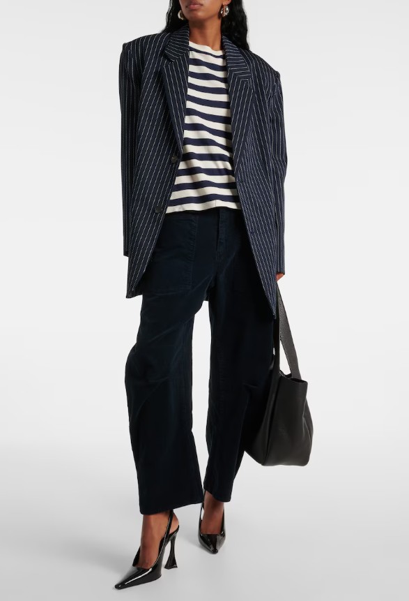 • Elegáns stílus: csíkos felső, blézer, magas derekú nadrág, arany ékszer